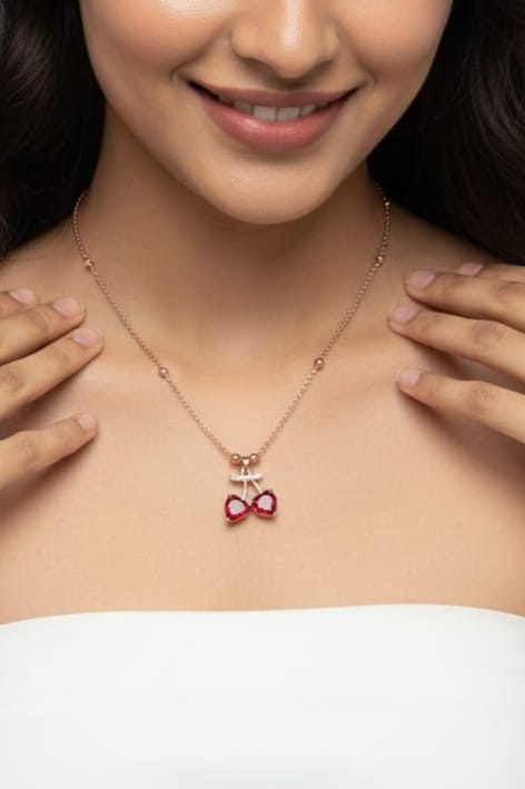 This charming necklace features a delicate rose gold chain, adorned with a sparkling cherry pendant crafted from rich red gemstones. Its fresh and playful design brings a pop of color and elegance to any look, making it an instant favorite for every jewelry lover.