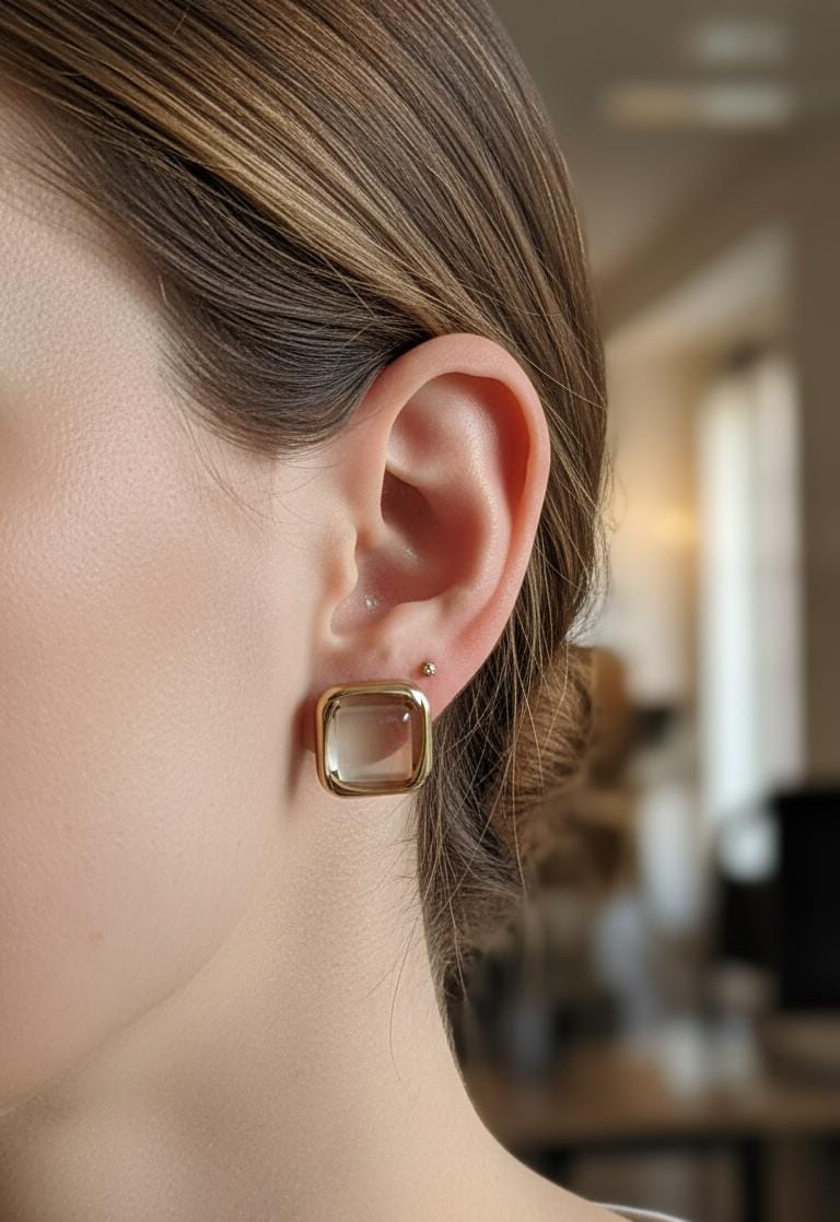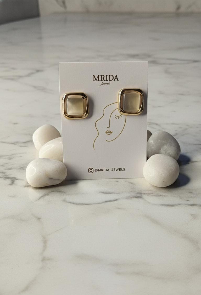 These stylish square earrings feature a glossy, translucent stone set in a sleek gold frame, blending minimalism with modern sophistication for a polished everyday look.