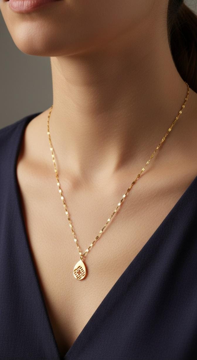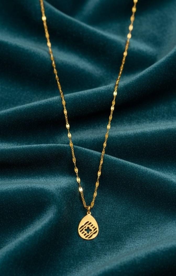 A sleek and elegant gold-toned necklace featuring a delicate, textured chain that adds a subtle sparkle with movement. The necklace is adorned with a small teardrop-shaped pendant engraved with a modern, minimalistic pattern, giving it a unique and contemporary charm. Lightweight and refined, anti tarnish this piece is perfect for everyday wear as well as special occasions, complementing both western and ethnic outfits with its graceful simplicity.