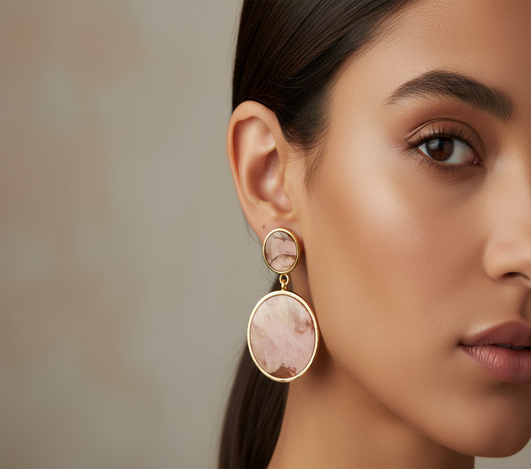 - Elegant and chic, these handcrafted earrings feature a dreamy pink marble effect set in a golden frame.