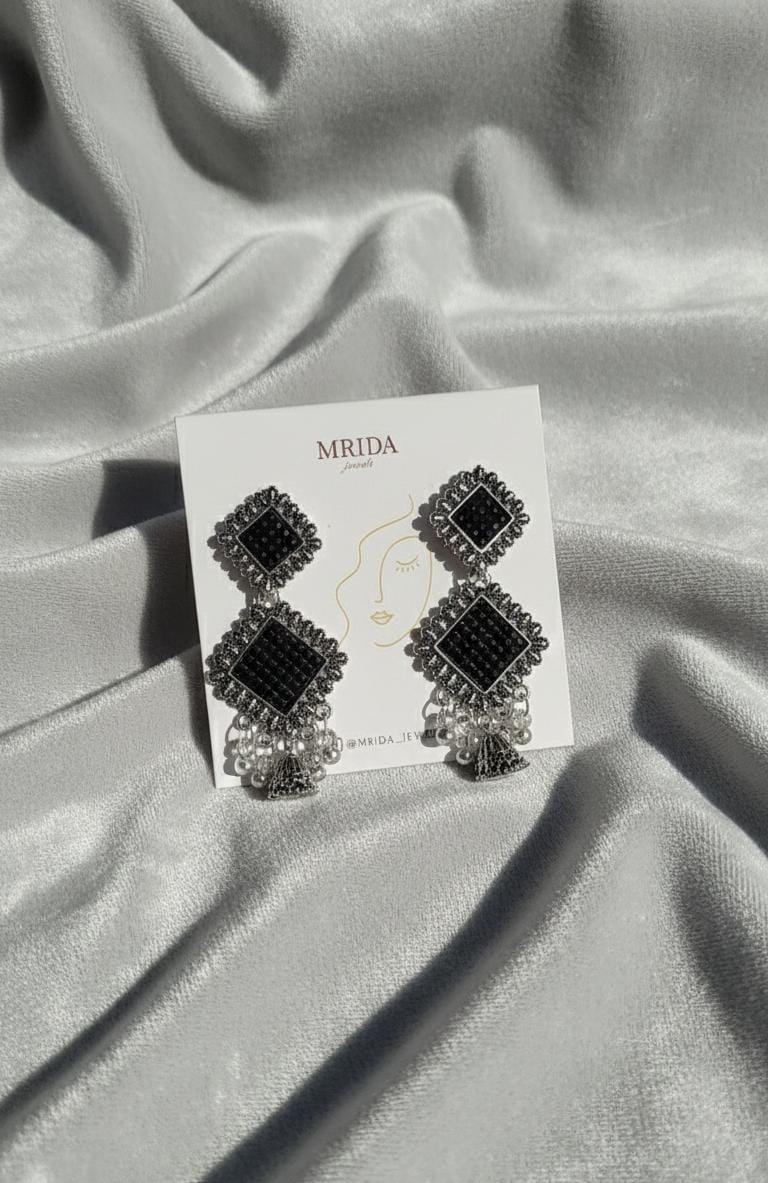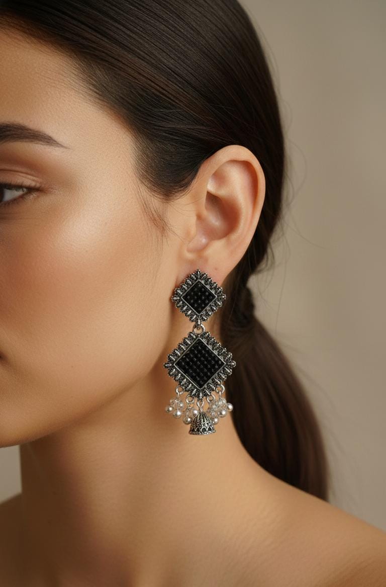 These earrings feature a striking oxidised silver finish paired with deep black accents, giving them a bold and elegant midnight-inspired look. The design consists of two stacked diamond-shaped elements—each filled with textured black detailing and framed with intricate oxidised borders. At the bottom, a cluster of delicate white pearl-like beads adds movement and contrast, enhancing the overall shimmer. The combination of antique silver tones, dark centerpieces, and soft pearly drops creates a dramatic yet sophisticated accessory perfect for festive, ethnic, or evening wear.