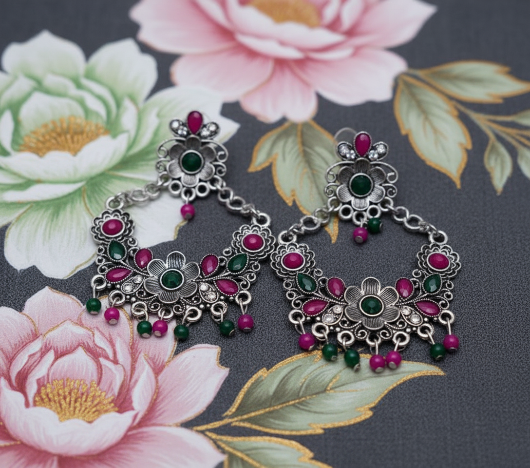- Embrace regal elegance with Royal Rajwada Drops, inspired by traditional Indian heritage. These intricately crafted silver earrings shine with vibrant pink and green stones, making them perfect to elevate any festive or ethnic outfit. Bold, beautiful, and timeless — a statement piece that turns every occasion into a royal celebration.